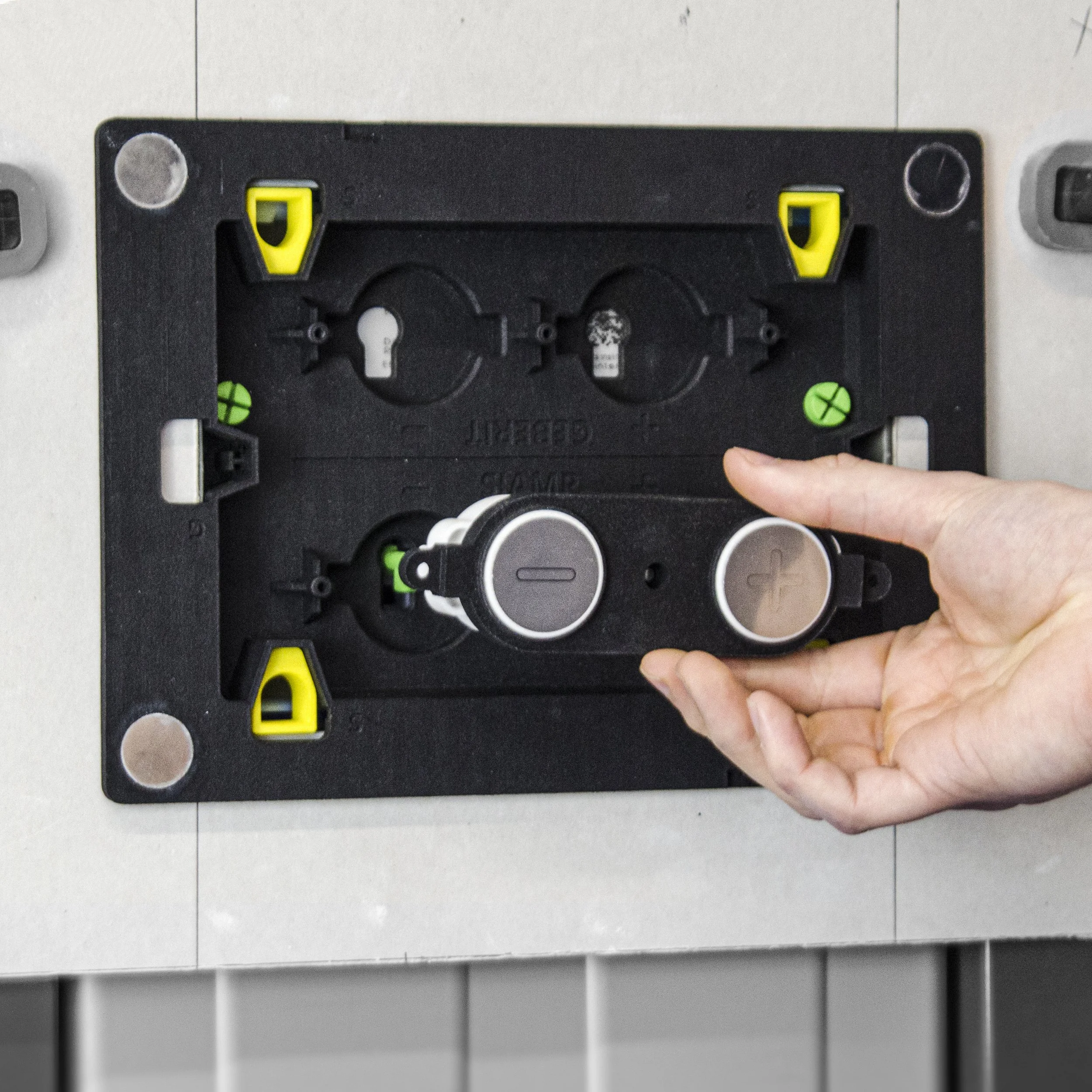 Although this flush plate looks simple on the outside, it needed to accommodate a vast number of installation types. Firstly, the device must mount to two completely different cisterns sold by the market leaders – Geberit and Siamp. These systems have different mounting positions and flush mechanisms. Beyond this, we needed to account for different wall thicknesses and types.